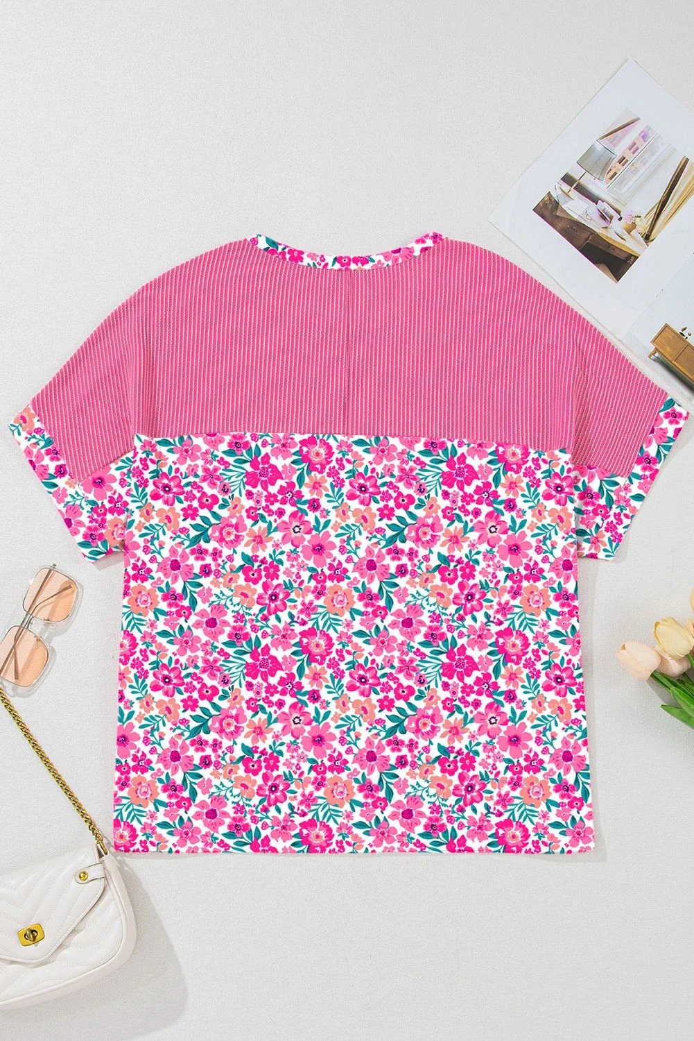 Pink Plus Size Floral Print Corded Patchwork Loose Top